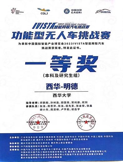 西华明德队在天津的“2023世界智能驾驶挑战赛(WIDC)”中的获奖证书