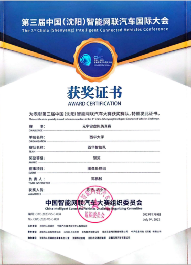 西华卓越队在天津的“2023世界智能驾驶挑战赛(WIDC)”中的获奖证书