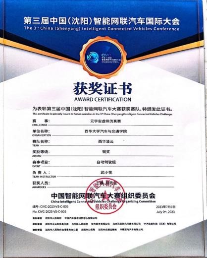 “西华明德”智能车队由tyc41183太阳成集团汽车与交通学院新能源与智能汽车团队研究生组建,主要成员包括张准、周思弈、陈浩、屈先圣、张金安、张鑫和胡小东等,指导教师为邓鹏毅、孙树磊和田国英等。今年以来,团队研究生在全国性高水平自动驾驶技术比赛中屡获佳绩。5月,“西华卓越队”(陈云鑫、张鑫)、“西华明德队”(张准、张金安)在天津的“2023世界智能驾驶挑战赛(WIDC)-元宇宙虚拟仿真赛”中,获得优秀奖(第四、五名)。7月,“西华智信队”(陈浩、胡小东)、“西华凌云队”(王晨、屈先圣)在沈阳的“第三届中国(沈阳)智能网联汽车国际大会-元宇宙虚拟仿真赛”中分获银奖(第二名)、铜奖(第四名)。