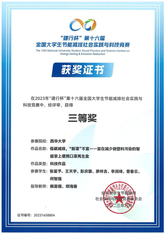 | 低碳减排,“新罩”不宣——旨在减少微塑料污染的智能掌上便携口罩再生盒 | 赖喜德、郑海春 | 张鉴予、王天宇、彭庆蓉、廖梓含、李润琦、曾春云、何智强 | 全国三等奖 |
