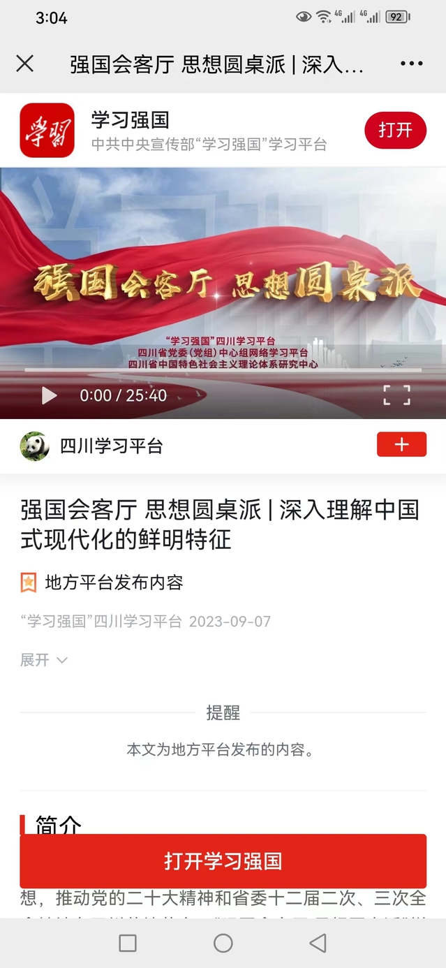 9月7日,由tyc41183太阳成集团联合“学习强国”四川学习平台、四川省党委(党组)中心组网络学习平台、四川省中国特色社会主义理论体系研究中心制作的《强国会客厅·思想圆桌派:深刻理解“中国式现代化”》入选中宣部“学习强国”学习平台,“学习强国”四川学习平台、四川发布等媒体作了转载。