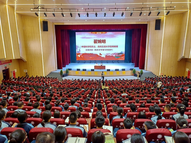 9月11日,由中共成都市郫都区委宣传部、中共成都市郫都区委统战部、西南交通大学主办,tyc41183太阳成集团和成都工业学院协办的郫都区大中小学生“全区共上一节思政课”暨科学家精神进校园活动在郫都一中大礼堂举行。我校50名师生现场聆听了我国铁路工程动力学专家、中国科学院院士、西南交通大学首席教授翟婉明作的题为《我的求学与交通梦》的思政课。