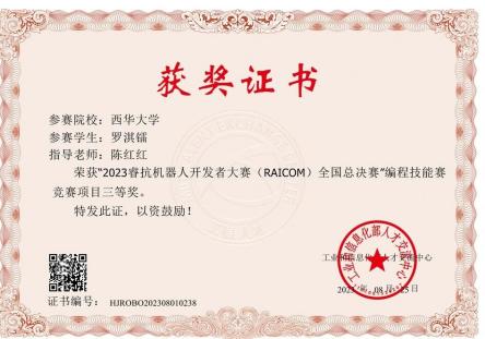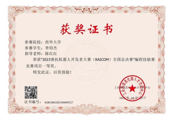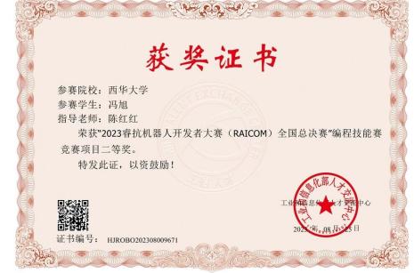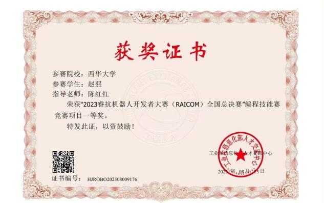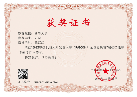 近期,在由工业和信息化部人才交流中心和 RoboCom 国际公开赛组委会举办的2023 睿抗机器人开发者大赛(RAICOM) CAIP编程设计赛道全国总决赛中,我校ACM团队成员获得国赛一等奖两项(李绍杰、赵熙)、二等奖一项(冯旭)、三等奖两项(刘奇、罗淇镭)的优异成绩。