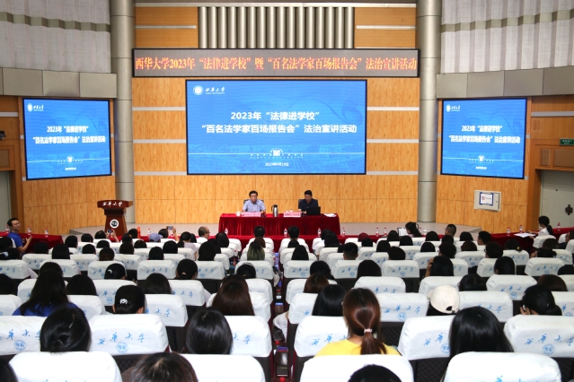 为进一步深入学习贯彻习近平法治思想,切实推进依法治校、治学、育人,在全校营造尊法、学法、守法、用法的良好氛围。9月19日下午,2023年“法律进学校”暨“百名法学家百场报告会”法治宣讲活动在郫都校区四教报告厅举办,四川省 2023年“双百”活动法治宣讲团成员、西南财经大学法学院高晋康教授受邀作宣讲报告。报告会由校党委副书记张力主持,法学与社会学学院、马克思主义学院等学院教师和学生代表参加报告会。