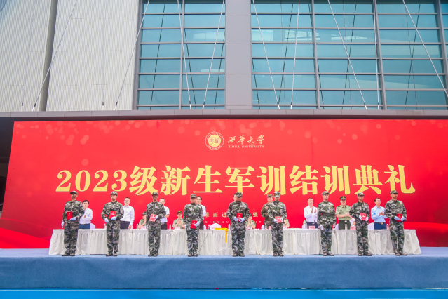 副校长许州宣读了《关于表彰2023级学生军训优秀教官、优秀政治指导员、优秀连队、优秀学员的决定》。主席台领导嘉宾为优秀教官代表、优秀政治指导员代表、优秀连队代表、优秀学院代表颁奖。