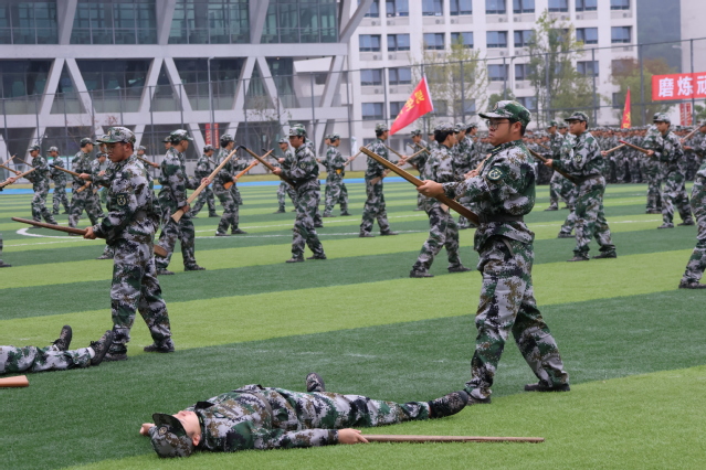 在观众们的欢呼声中,2023级学生军训汇报表演正式开始。旗语操、匕首术、刺杀操、擒敌术、应急棍术、战术动作完美展现,14天军训的成果充分得到展示。