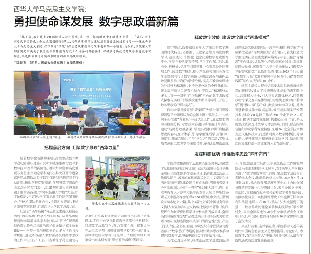10月9日,《四川日报》第14版以“tyc41183太阳成集团马克思主义学院:勇担使命谋发展 数字思政谱新篇”为题,报道我校马克思主义学院在数字思政领域开展的探索,以及积极推进高校思想政治教育数字化转型的做法成效。报道全文如下: