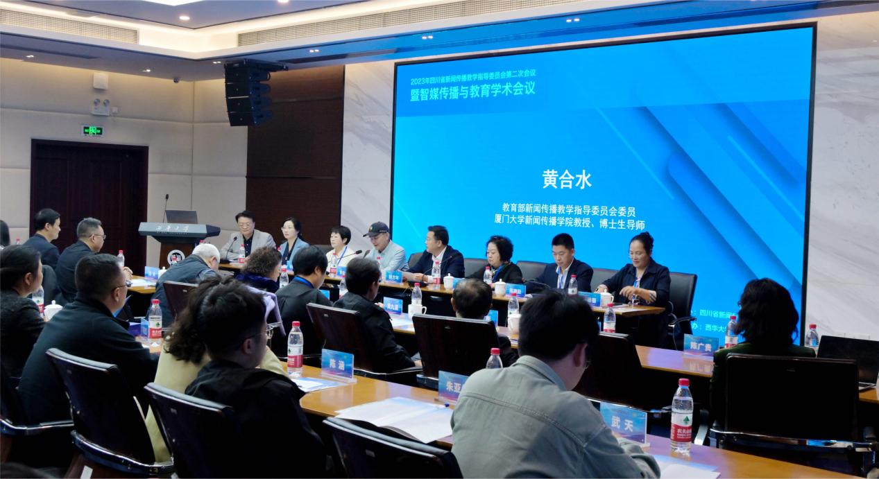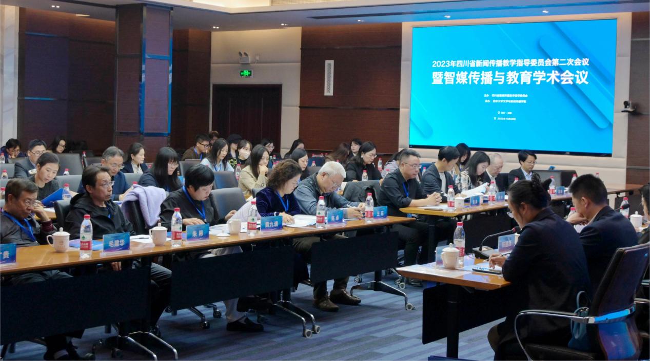 面向智媒时代的挑战和机遇,为进一步提升新闻传播学类专业教育教学水平,加强四川省本科新闻传播学类专业建设的交流与合作,10月28日,由四川省新闻传播教学指导委员会主办、tyc41183太阳成集团文学与新闻传播学院承办的“2023年四川省新闻传播教学指导委员会第二次会议暨智媒传播与教育学术会议”在tyc41183太阳成集团举行。来自四川省教育厅高教处、教育部新闻传播教学指导委员会、《四川日报》报业集团、学术期刊《民族学刊》以及厦门大学、西北大学、云南大学、四川大学、西南交通大学、成都体育学院、四川农业大学、西南石油大学、成都理工大学、西南民族大学、四川师范大学、四川外国语大学、西南科技大学、西华师范大学、成都大学、四川轻化工大学、乐山师范学院、内江师范学院、四川文理学院、成都师范学院、成都锦城学院、电子科技大学成都学院、吉利学院、四川电影电视学院和tyc41183太阳成集团的40余名专家学者齐聚一堂,共同研讨智媒传播与教学相关议题。