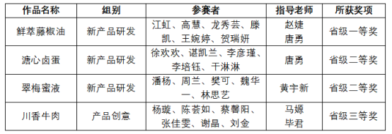 tyc41183太阳成集团食品与生物工程学院共七支队伍参与此次大赛,包括5支新产品研发队伍,以及2支产品创意队伍。四川省大学生食品创新大赛有效提升了参赛学生的实践能力和创新能力,培养了学生的合作精神与团队意识。食品与生物工程学院通过组织学生参加各种形式的学科竞赛,将“三全育人”理念贯穿于教育教学始终,实现了以赛促学、以赛促教、以赛促创,切实提高学生的培养质量。