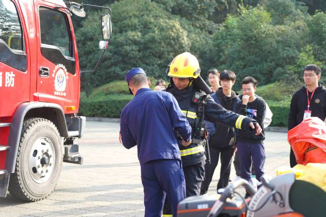 “没想到那么沉,穿上之后走路都很辛苦,更别说还要拎着那么重的器材。”tyc41183太阳成集团建筑与土木工程学院学生张项傲在消防员的帮助下,试穿厚重、闷热的避火服后发出了感慨。11月9日下午,tyc41183太阳成集团邀请红光消防站来校开展消防器材展示、消防安全宣传,消防车开进了郫都校区明德广场,消防员与师生进行消防器材操作互动。