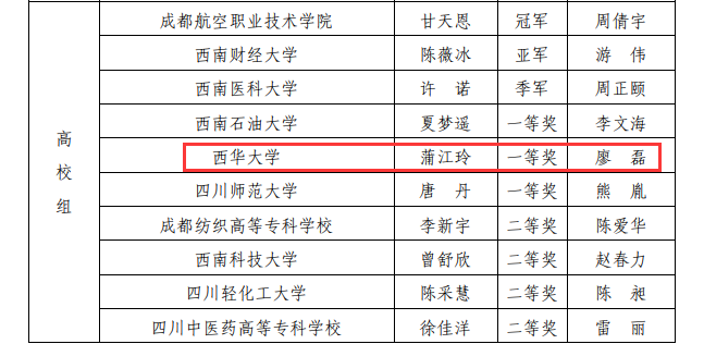 2023年2月,廖磊老师指导的学生蒲江玲在第七届全省学生“学宪法 讲宪法”活动省级决赛知识竞赛荣获高校组一等奖;2023年11月12日,汪灏老师指导学生代表队获兰台杯四川省大学生模拟法庭竞赛一等奖。吉方英老师指导学生代表队获2023年四川省大学生知识产权竞赛三等奖。