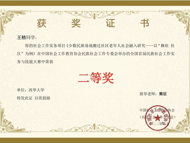 以赛促学,提高学生专业水平和理论联系实际的能力。近年来学院学子在“‘挑战杯’全国大学生课外学术科技作品竞赛”、“‘美好社会•益起参与’四川省大学生公益项目设计大赛”、四川省大学生知识产权竞赛、“全国民族社会工作实务与技能大赛”、“四川省大学生模拟法庭大赛”等国家级、省部级赛事中获得佳绩,展现了学院在专业人才培养方面的显著成效。2022年8月,冉连教师指导的本科生团队在第二届大学生社会保障案例大赛荣获一等奖;11月,熊征老师指导学生荣获“全国民族社会工作实务与技能大赛”二等奖。