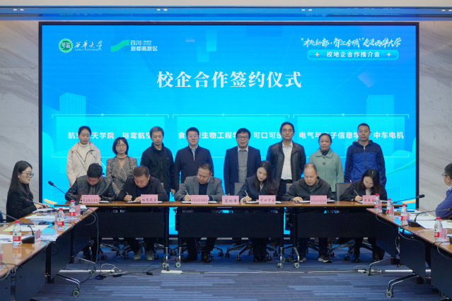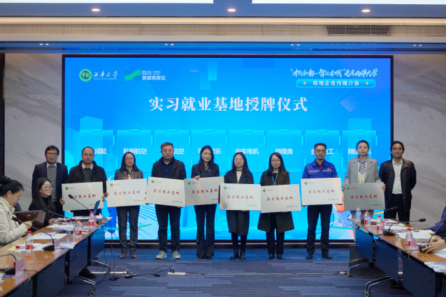 新都现代交通产业功能区党工委副书记、管委会主任张启明详细介绍了功能区建设历史、产业布局、重点企业,希望以此次活动为契机,进一步整合校内资源与社会资源,聚焦人才联合培养、企业科研攻关、学校成果转化,充分发挥高校的专业、人才和园区的政策、产业集聚等综合优势,不断开拓校地企合作新路径,实现企业、学校、园区三方共赢,共同高质量发展壮大。新都区人才发展中心主任徐士棚宣讲新都区人才政策。随后,食品与生物工程学院党委书记熊华,航空航天学院党委书记徐元彬,电气与电子信息学院党委书记周良辉代表学校分别与中粮可口可乐饮料(四川)有限公司、成都裕鸢航空智能制造股份有限公司、成都中车电机有限公司签订人才供需协议,签约企业代表向学校授予“优质人才培养基地”牌匾。校党委副书记张力,副校长费凌向中粮可口可乐饮料(四川)有限公司、成都中车电机有限公司、成都裕航空智能制造股份有限公司、成都特隆美储能技术有限公司、成都航新航空装备科技有限公司、金杯电工(成都)有限公司、中汽成都配件有限公司、成都精密电机有限公司等8家企业授予“实习就业基地”牌匾。最后,航空航天学院党委书记徐元彬、成都裕鸢航空智能制造股份有限公司副总经理耿强分别作人才引荐发言。