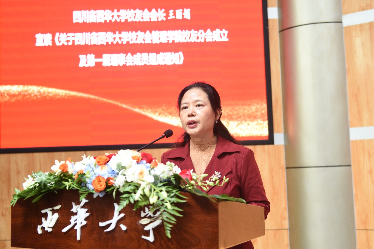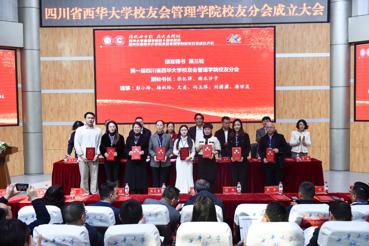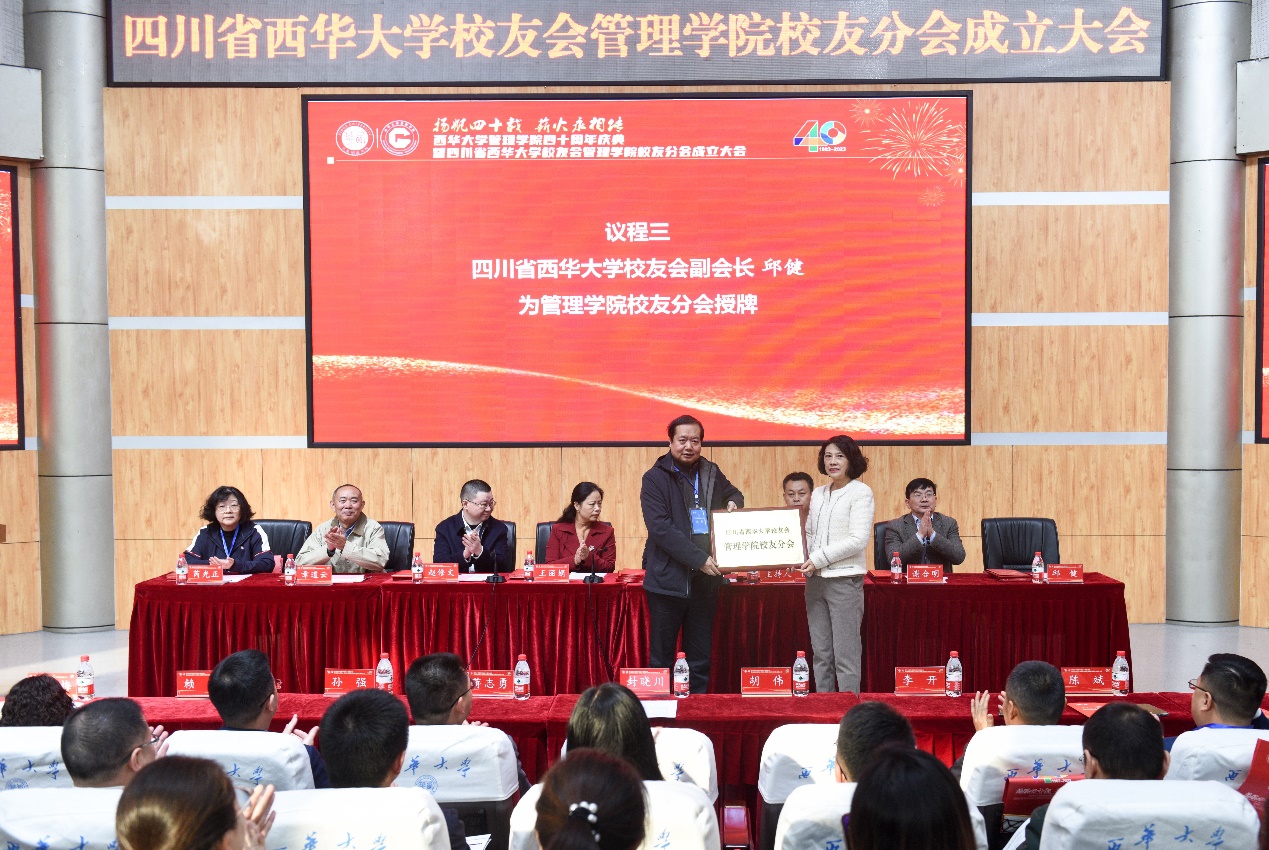 tyc41183太阳成集团校友会会长王丽娟宣读《关于四川省tyc41183太阳成集团校友会管理学院校友分会成立及第一届理事会成员组成通知》文件。tyc41183太阳成集团校友会副会长邱健为管理学院校友分会授牌。随后,主席台领导、嘉宾为第一届理事会成员颁发了聘书。
