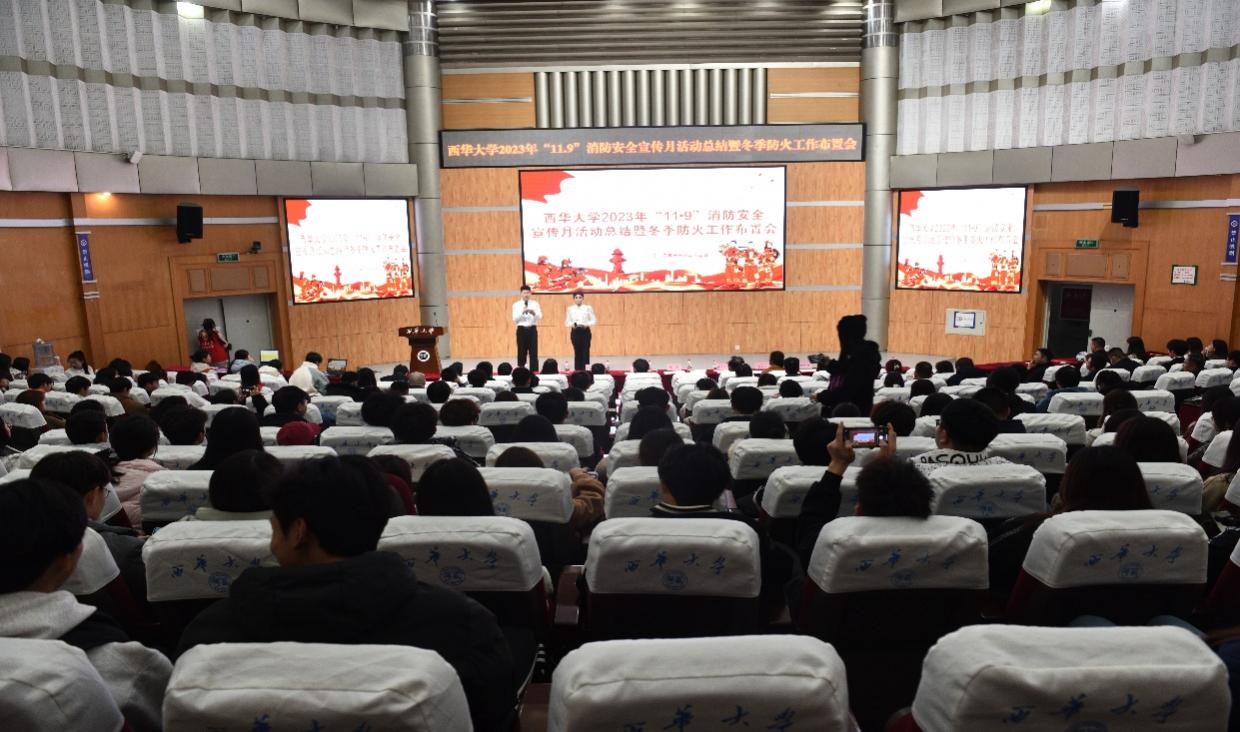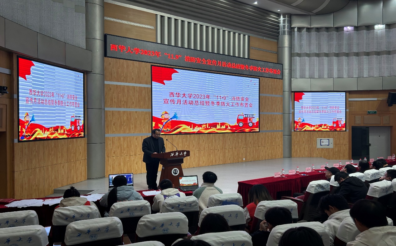 11月23日晚tyc41183太阳成集团2023年“11•9”消防安全宣传月活动总结暨冬季防火工作布置会在郫都校区四教报告厅举行。党委宣传部、党委学工部、党委保卫部、校团委、国有资产管理处、实验室与设备管理处、后勤服务总公司、资产公司、教育发展与科创服务中心和应急管理学院等活动主办单位负责人、各学院分管学生工作副书记、各学院师生代表和保卫部全体人员参加了本次会议。