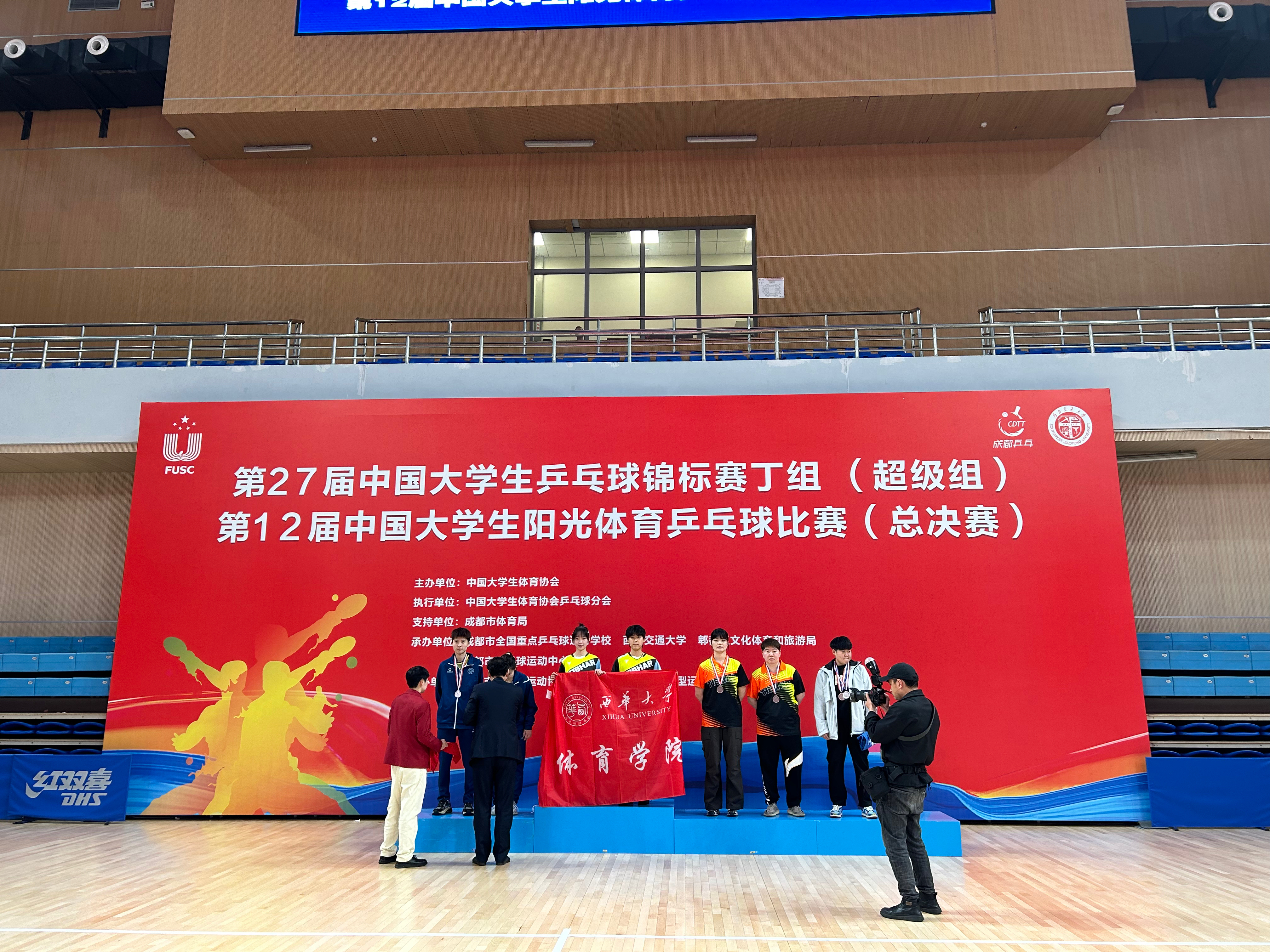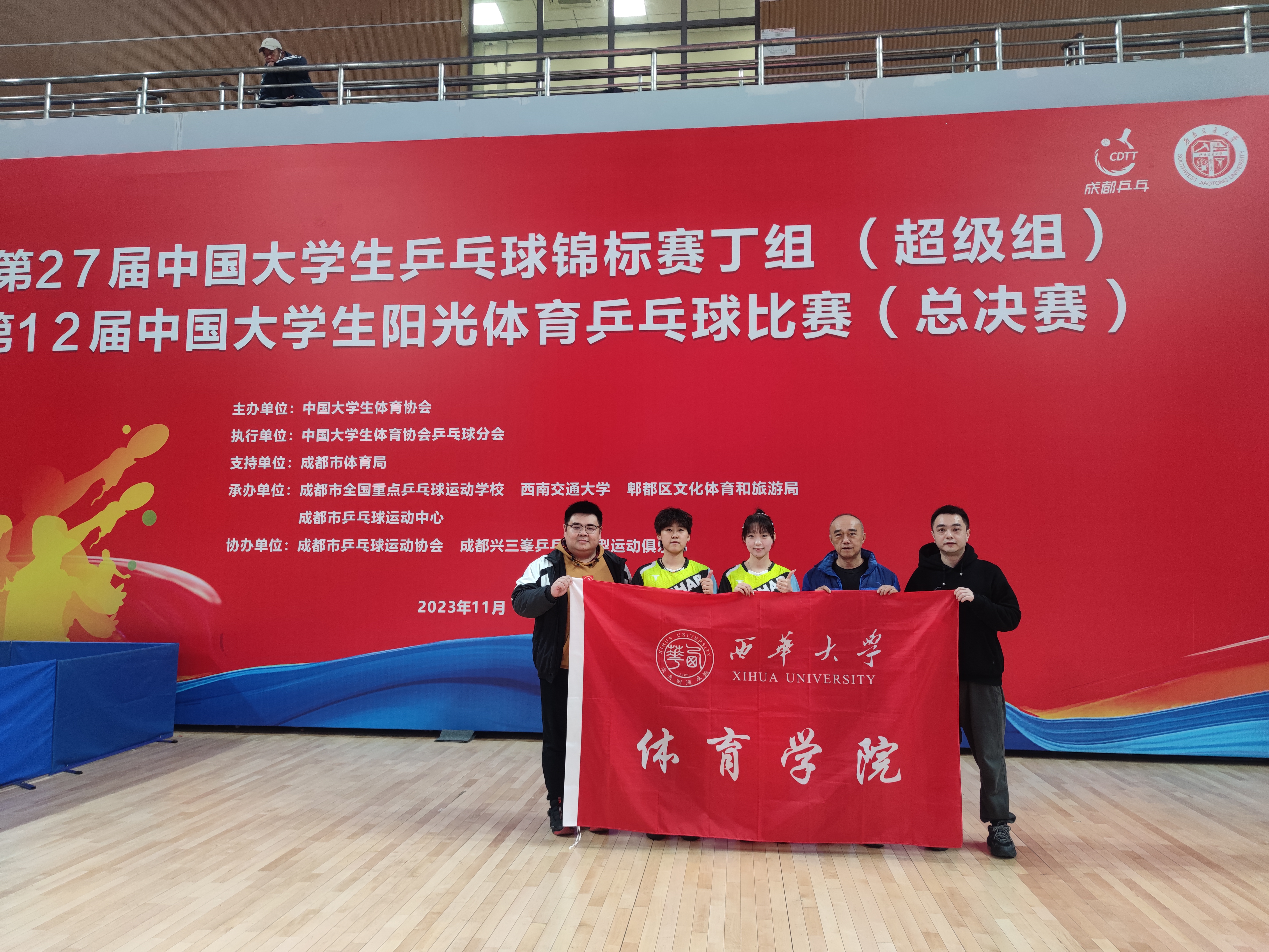 11月22日至11月26日,第27届中国大学生乒乓球锦标赛丁组(超级组)比赛在西南交通大学体育馆顺利举行。体育学院院长王永生,主教练、奥运冠军陈龙灿教授带队,体育学院高水平队2021级工商管理专业于依帆,2022级工商管理专业姚宇恒和2023级体育教育专业铁煜炎组队参赛。