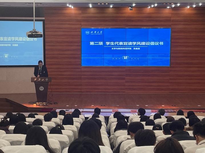 12月1日中午,140余名学生党员、校院两级学生组织主要学生干部齐聚图书馆报告厅,参加学风建设推进会暨学生骨干培训。与会代表就深入推进学风建设发出倡议,在学风建设倡议幕布上郑重签字。