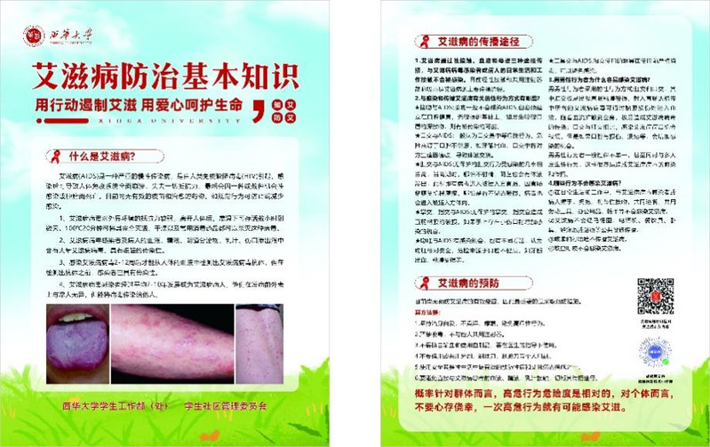 此外,各学院依托易班、QQ、微信公众号等网络平台开展线上防艾宣传,学生工作部印制了《艾滋病防治基本知识》宣传单,发放给全校学生,普及防艾相关知识。各学院辅导员、防艾同伴宣讲员开展防艾主题讲座、禁毒防艾主题班会等活动进行艾滋病防治教育,将禁毒防艾宣传融入学生日常学习生活中。