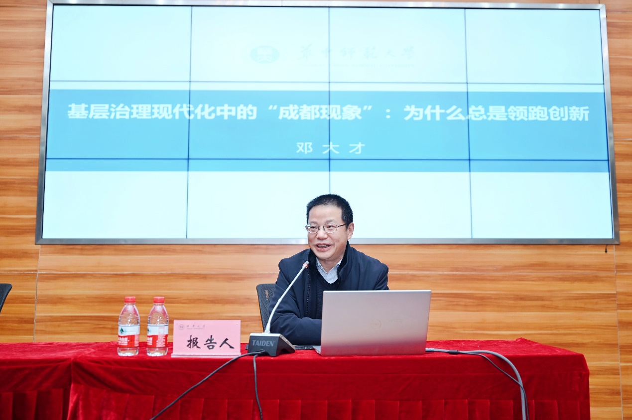 华中师范大学中国农村研究院邓大才教授作了题为“基层治理现代化中的‘成都现象’:为什么总是领跑创新”的主旨报告。邓大才教授根据自身在成都的调研经历,对基层治理现代化创新中的“成都现象”进行了深入探究,对成都的基层治理实践影响因素进行了高度凝练和概括,指出成都的创新有着体制性、增量性、可持续性和领先性特点,并从领导力结构、制度结构和文化结构三个方面分析了“成都现象”中的结构性因素。