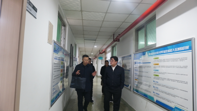 周国良一行首先参观了学校毕业生招聘场地建设情况。为助力毕业生高质量充分就业,学校夯实条件保障,完善人员配备、经费保障及场地设施。现有办公室5间,专场招聘教室10间,面试间3间,会议室2间,招聘场地2000余平方米,招聘所需软硬件设施设备齐全。