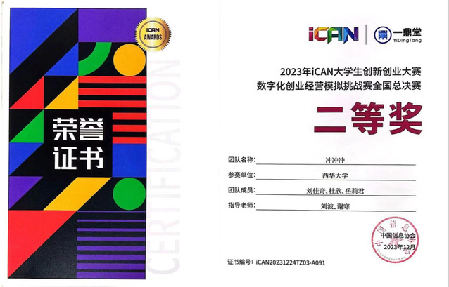 近日,由中国信息协会主办的iCAN大学生创新创业大赛数字化创业经营模拟挑战赛全国总决赛在江苏举办。由我校管理学院2022级财务管理专业刘佳奇、岳莉君和2022级物流管理专业杜欣组成的“冲冲冲”队,在指导老师刘波、谢寒的指导下,荣获全国二等奖。