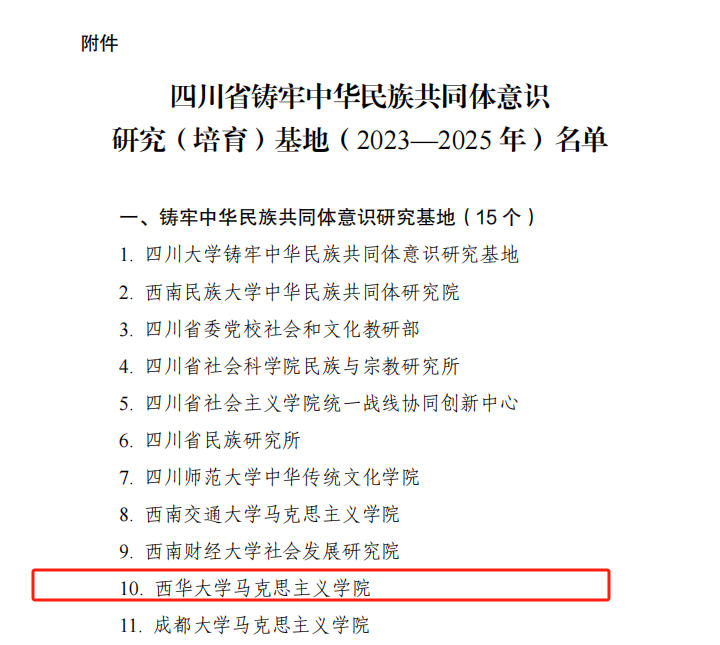 近日,四川省民族宗教事务委员会、中共四川省委统战部、中共四川省委宣传部、四川省教育厅印发《关于命名全省铸牢中华民族共同体意识研究(培育)基地(2023—2025年)的通知》,命名tyc41183太阳成集团马克思主义学院等15家单位为全省铸牢中华民族共同体意识研究基地(2023—2025年)。