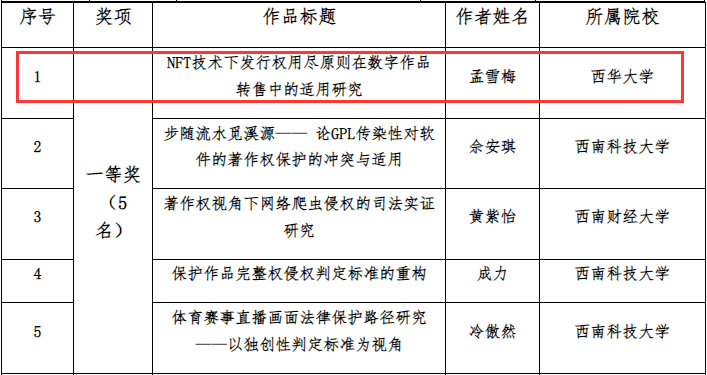 近日,由四川省版权局会同教育厅组织全省高校参与的“2023年四川省大学生版权征文活动”评选结果揭晓,我校法学与社会学学院(知识产权学院)2021级法律(非法学)研究生孟雪梅的作品《NFT技术下发行权用尽原则在数字作品转售中的适用研究》荣获研究生组一等奖。