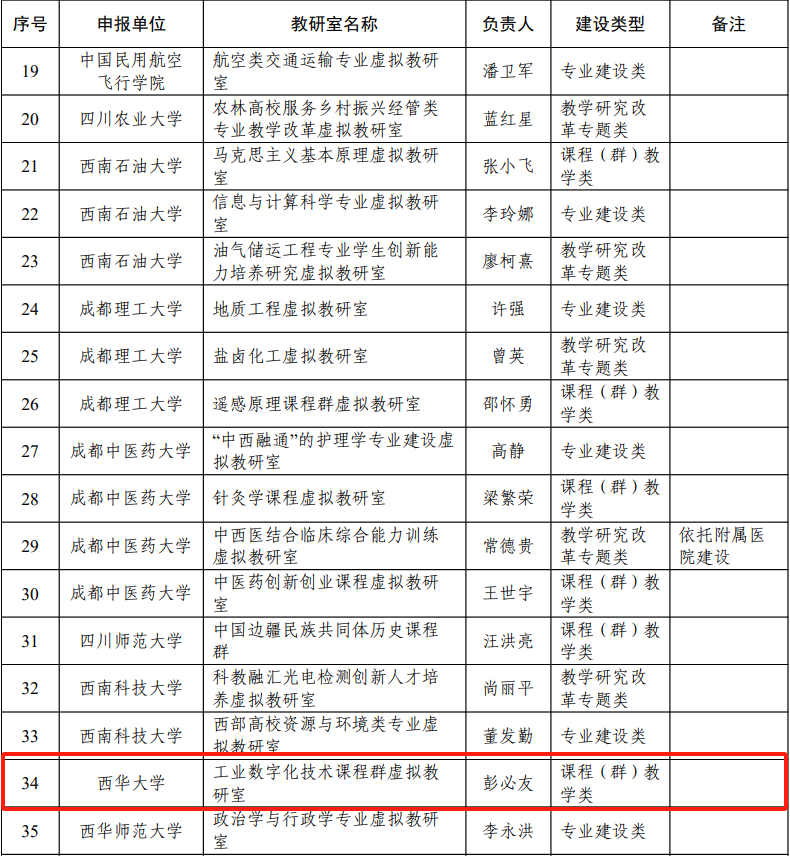 近日,四川省教育厅公布了第二批省级虚拟教研室建设试点名单(川教函〔2024〕100号),全省共50个虚拟教研室试点建设,由我校材料科学与工程学院彭必友教授负责申报的“工业数字化技术课程群虚拟教研室”获批入选。