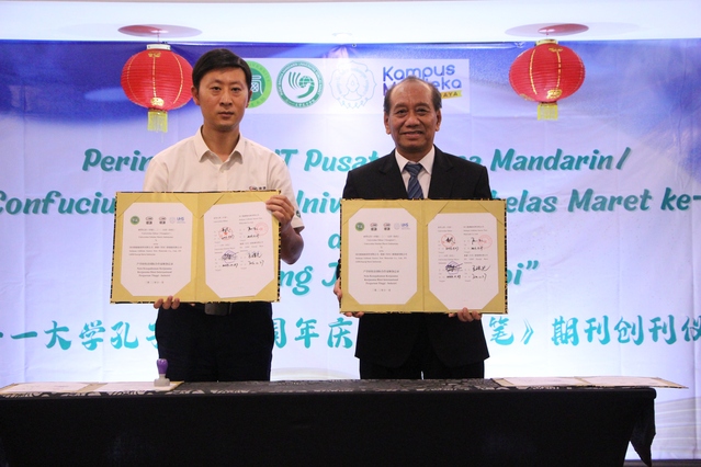 揭牌仪式后,孔子学院的又一崭新成果——新期刊《毛笔》举行了创刊仪式,孔子学院中方院长樊洁介绍了《毛笔》的创立初衷和发展愿景。据悉,《毛笔》是继《Mandarinable》之后推出的第二本学术期刊,关注语言、文学、文化、教育、历史和新闻学等领域的最新研究和前沿动态,期待为促进中印尼学术交流带来新气象。