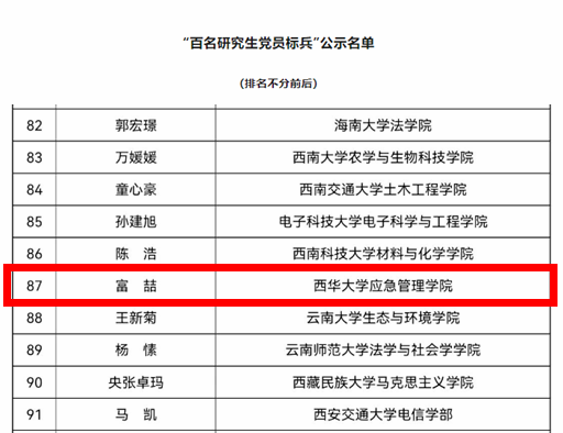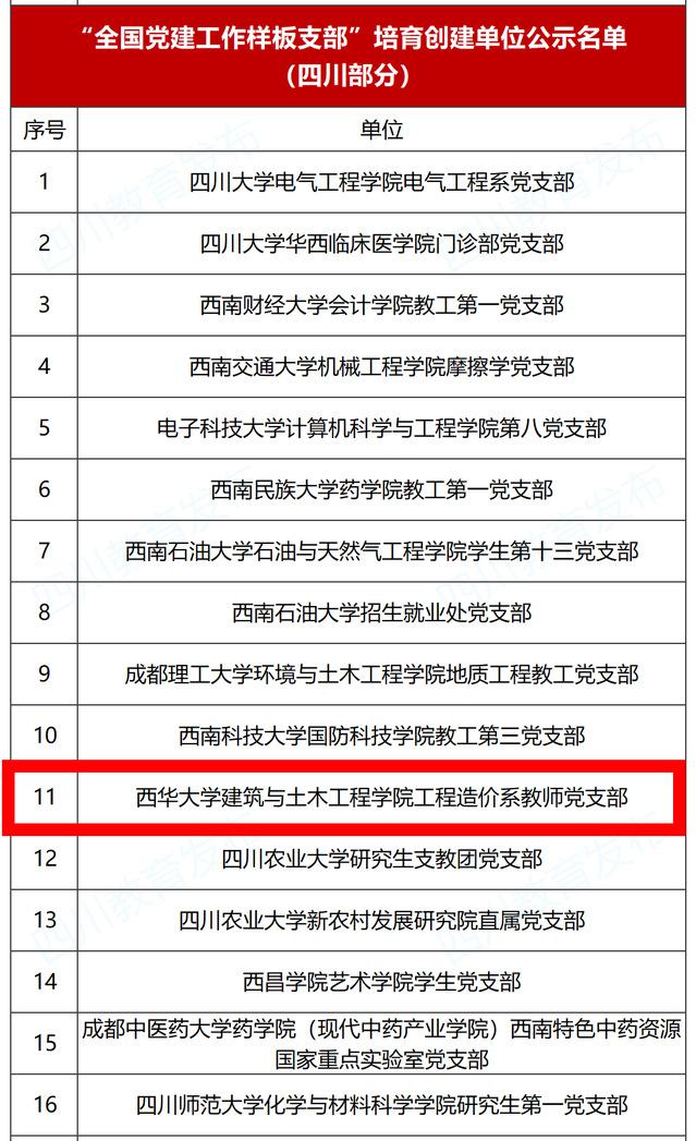 3月18日,教育部分别公示了第四批新时代高校党建示范创建和质量创优工作遴选结果、第三批全国高校“百个研究生样板党支部”和“百名研究生党员标兵”遴选结果名单。经省级党委教育工作部门推荐、资格审查、专家评审、集中审议,遴选产生了10个全国党建工作示范高校、100个全国党建工作标杆院系、1001个全国党建工作样板支部,以及100个研究生样板党支部和100名研究生党员标兵。其中,我校建筑与土木工程学院工程造价系教师党支部入选“全国党建工作样板支部”培育创建单位,应急管理学院2021级土木水利专业硕士生富喆获评“百名研究生党员标兵”。此外,在中共四川省委教育工委公布的“第二批新时代四川高校党建示范创建和质量创优培育单位”名单中,我校现代农业装备研究院教师党支部入选“四川高校党建工作样板支部”培育单位,马克思主义学院2021级研究生党支部入选四川高校“研究生样板党支部”培育单位。