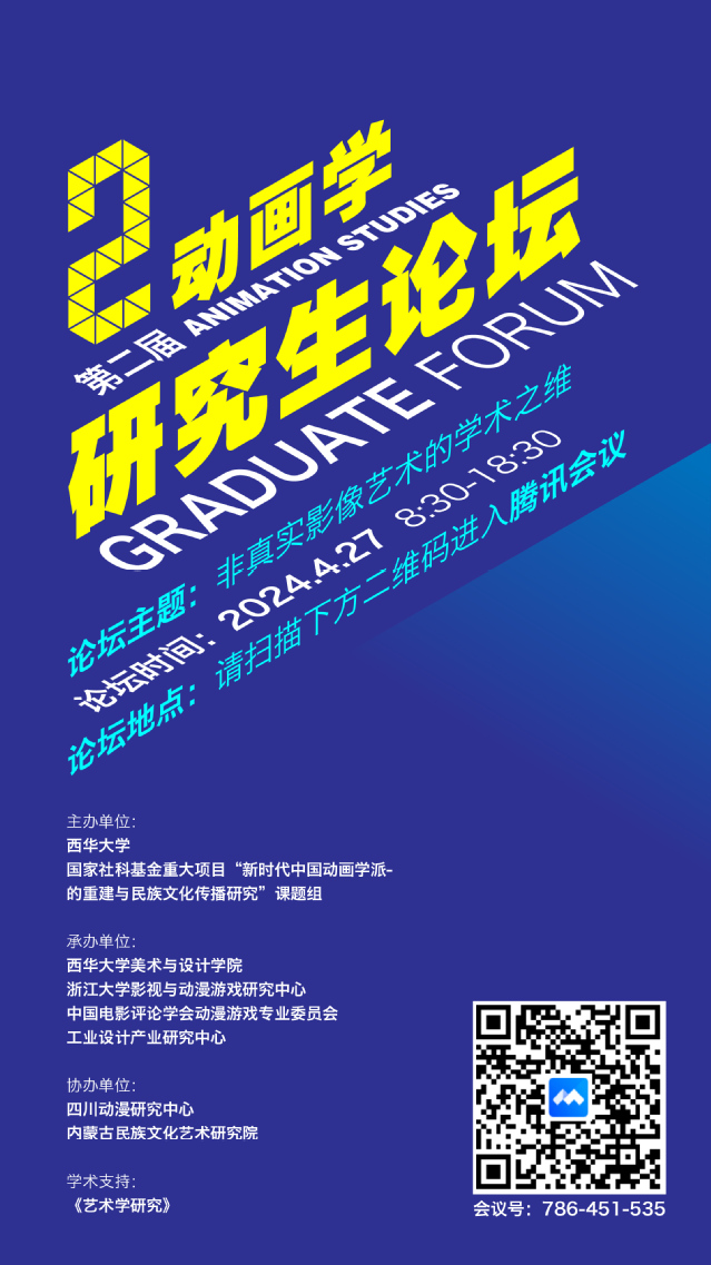 4月27日,由tyc41183太阳成集团、国家社会科学基金重大招标项目“新时代中国动画学派的重建与民族文化传播研究”课题组主办的“第二届动画学研究生论坛”在线上成功举办。本次论坛以“非真实影像艺术的学术之维”为主题,吸引了来自国内外高校动画及相关专业博硕士研究生的广泛参与,征集到论文近百篇,经过国内知名动画学者2轮评审,80篇论文入选,最终确定24篇论文进入主论坛3个单元的报告会。