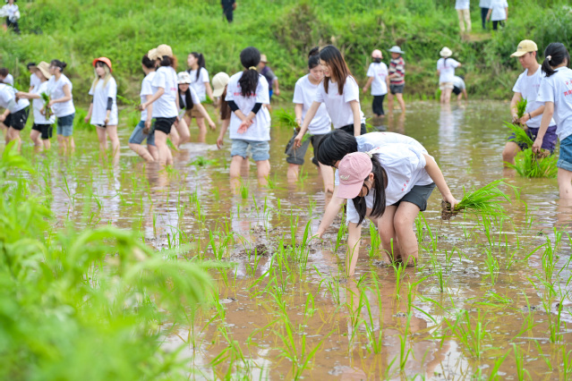 师生们在当地插秧能手的带领示范下,认真学习插秧技能和注意事项。经过简短学习后,大家低着头,弓着腰,左手熟练地捋送秧苗,右手轻盈地将秧苗快速、准确地插入泥土之中。指间的秧苗在稻田里由点成线,由线成片,一行行插好的秧苗整齐有序,随风摇曳,展露勃勃生机。