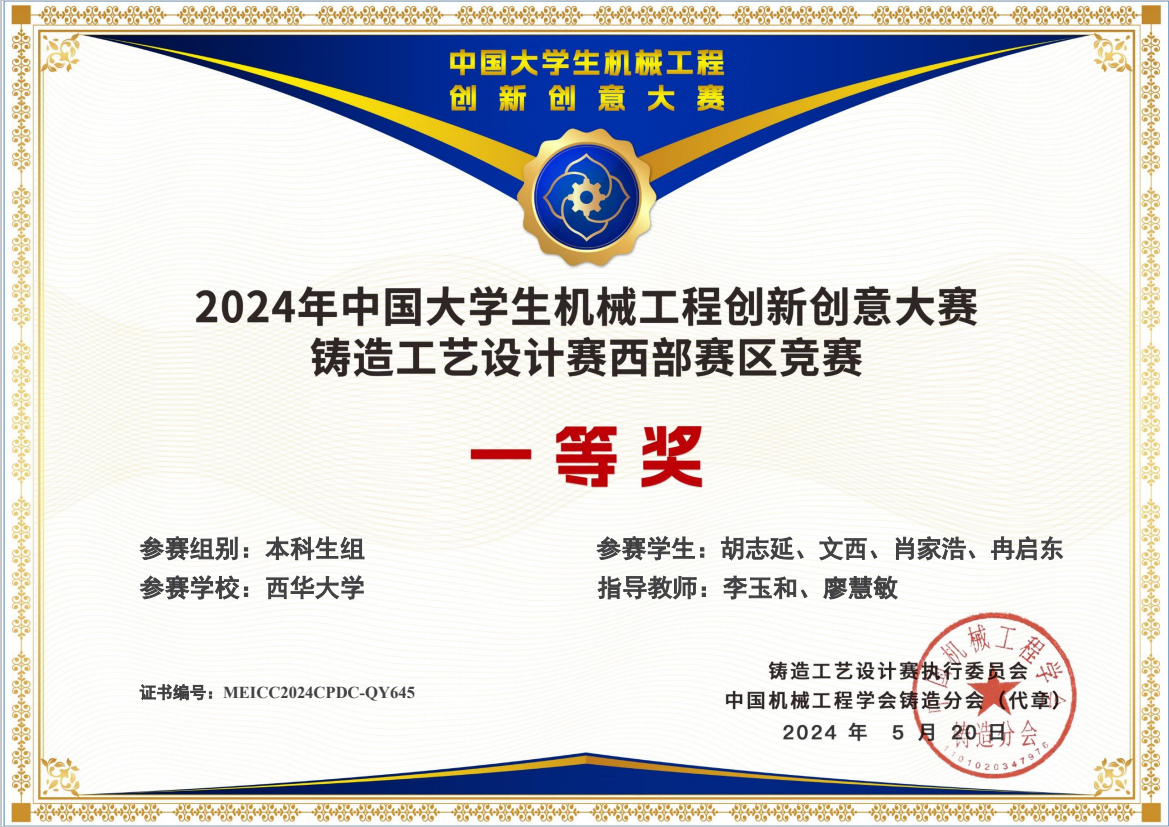 作为国家级赛事“中国大学生机械工程创新创意大赛”的分赛,铸造工艺设计赛的赛事水平及影响力不断提高。本次赛事共有132所院校的1715份作品参赛,参赛学生共计5951名。经过激烈角逐,共评选出获奖作品741份,其中西部赛区一等奖作品54份,二等奖作品86份,三等奖作品18份。我校材料科学与工程学院李玉和、何汇川、万维财、梁孟霞、黄红键等老师指导的8组作品全部荣获一等奖。