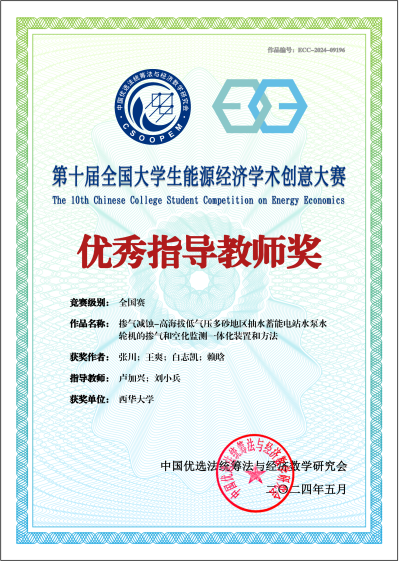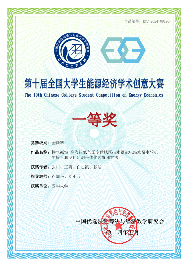 最终,我校刘燕、蒲亭旭、罗梓嘉、李朝云4位同学的作品《基于系统动力学的退役光伏回收—利用产业链差异化发展路径研究报告》获大学生组全国特等奖;张川、王爽、白志凯、赖晗4位同学的作品《掺气减蚀—高海拔低气压多砂地区抽水蓄能电站水泵水轮机的掺气和空化监测一体化装置和方法》获研究生组全国一等奖;刘小兵教授、卢加兴副教授、罗钰副教授、张力副教授荣获“优秀指导教师奖”。