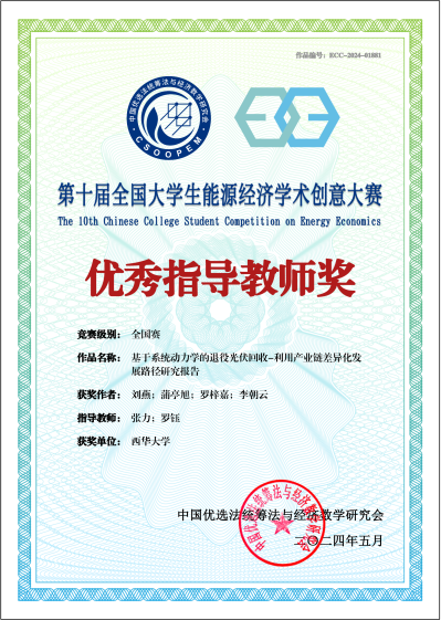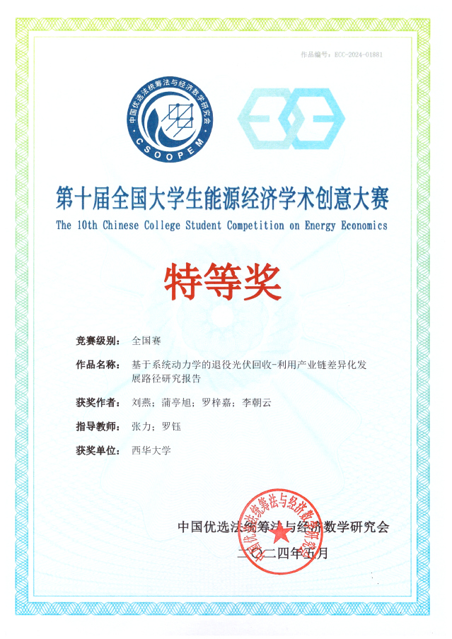 近日,由中国优选法统筹法与经济数学研究会、中国地质大学(北京)和中国高等教育学会资源能源教育分会联合主办,低碳发展管理专业委员会和中国地质大学(北京)承办的第十届全国大学生能源经济学术创意大赛全国总决赛在北京举行。经过校赛、区域赛、全国赛三级赛制的激烈评选后,西华学子再创佳绩,荣获全国特等奖1项、全国一等奖1项、全国二等奖1项,区域赛一等奖3项、区域赛三等奖2项。