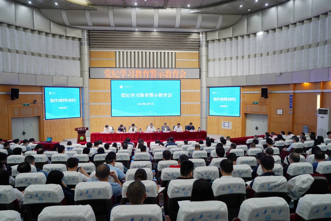 6月7日,学校在四教报告厅召开党纪学习教育警示教育会,传达学习习近平总书记关于全面加强党的纪律建设的重要论述,通报剖析学校违纪违法典型案例和审查调查工作情况,教育引导党员干部自觉学纪、知纪、明纪、守纪,切实推动党纪学习教育走深走实、见行见效,为学校事业高质量发展提供坚强纪律保障。校党委书记刘树根主持会议并讲话。