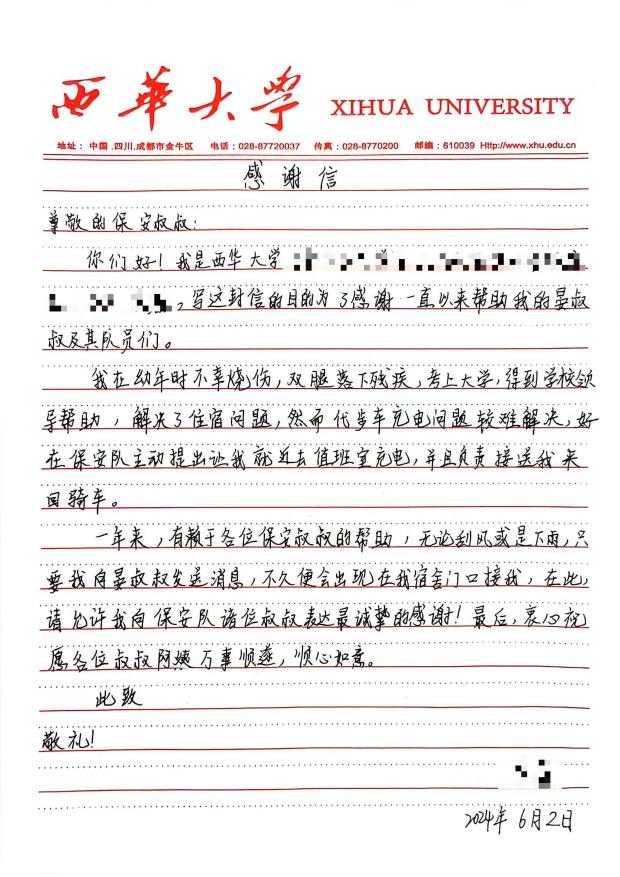 62日,一名同学将一封手写的感谢信送到了保安队晏国林队长手中,感谢信字里行间表达着对保安队员的感激之情。