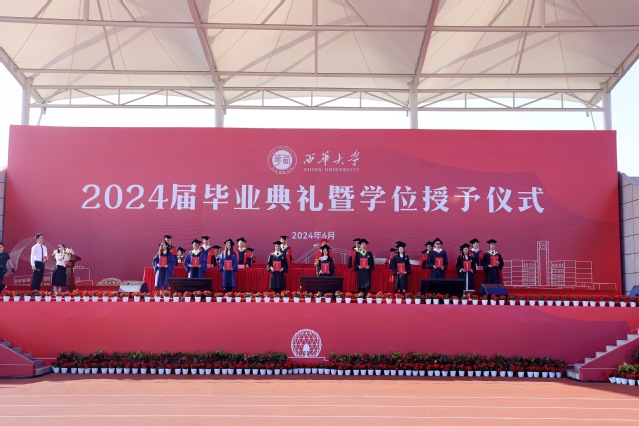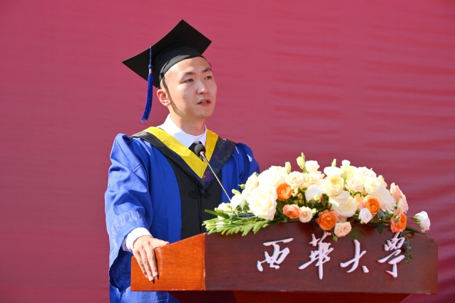 机械工程学院学生罗丕江作为本科生代表发言。他谈到,在西华学习这几年,学校教会了他努力向外看,学会向内求,坚定向前走。他号召全体毕业生,无论前往何方,身处何地,要牢记“求是、明德、卓越”的西华校训,牢记母校的殷切嘱托,带着西华人的责任担当,逐梦赴山海,扬帆再起航。