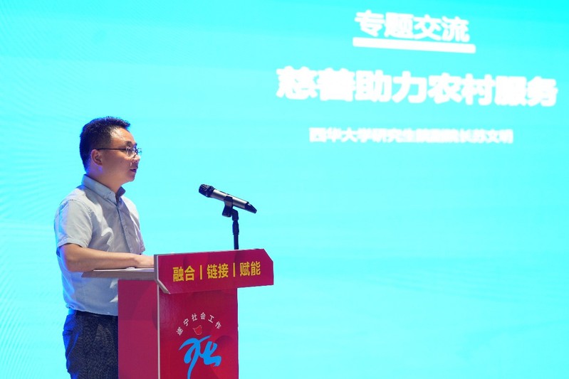 苏文明主持了“党建引领、专业牵引”慈社融合主题交流活动和圆桌会议环节并作“农村慈善的公共服务供给”专题报告,遂宁市委社工副部长、tyc41183太阳成集团硕士生导师田贵凡作“慈善社工融合发展的地方实践”专题分享。