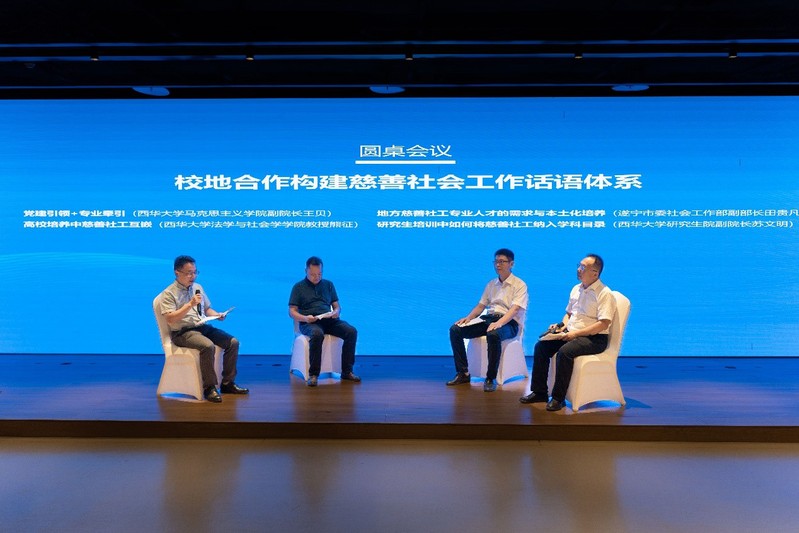 在圆桌会议环节,苏文明、王贝、熊征、田贵凡围绕“校地合作构建慈善社会工作话语体系”主题,从“党建引领+专业牵引”“地方慈善社工专业人才的需求与本土化培养”“高校培养中慈善社工互嵌”“社会工作专业培养方案修订”等展开了互动交流。