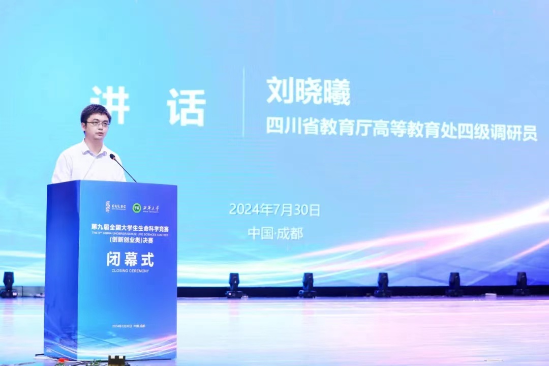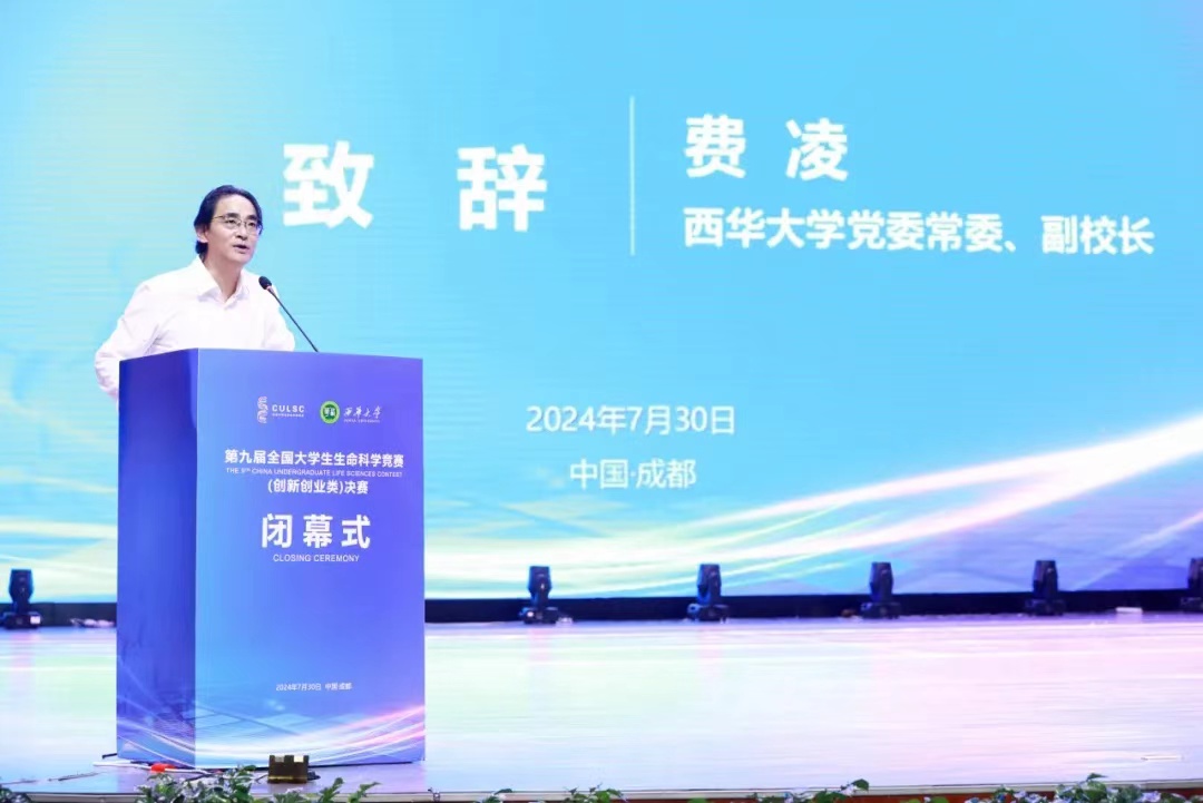 7月30日下午,闭幕式在我校艺术大楼大剧场举行。全国大学生生命科学竞赛委员会主任委员、复旦大学乔守怡教授,全国大学生生命科学竞赛监督委员会主任委员、上海交通大学林志新教授,教育部生物技术、生物工程类教指委副主任委员、南昌大学朱友林教授,全国大学生生命科学竞赛委员会副主任委员、上海交通大学张雪洪教授,全国大学生生命科学竞赛委员会(创新创业类)监督委员会主任委员、教育部生物技术/生物工程类教指委委员、华中科技大学余龙江教授,四川省教育厅高等教育处四级调研员刘晓曦、tyc41183太阳成集团党委常委、副校长费凌以及评审专家、监督委员等应邀出席闭幕式。