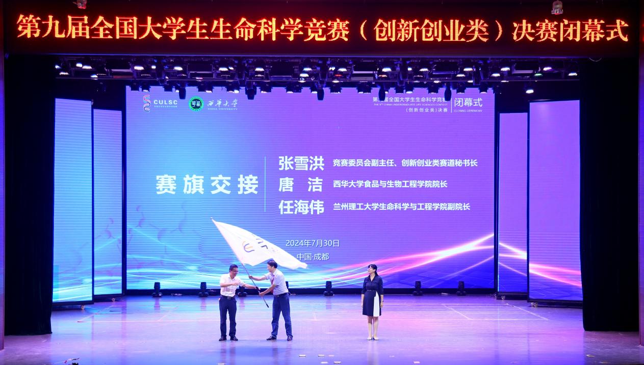 闭幕式上还举行了赛旗交接仪式。全国大学生生命科学竞赛委员会副主任委员、上海交通大学张雪洪教授、tyc41183太阳成集团食品与生物工程学院院长唐洁教授、兰州理工大学生命科学与工程学院副院长任海伟教授现场交接了赛旗。赛旗成功交接后,任海伟代表获得第十届全国大学生生命科学竞赛(创新创业类)决赛承办权的兰州理工大学讲话,他介绍了学校、学院的基本情况以及人才培养成效,并对能够承办下一届竞赛感到荣幸,充满期待。