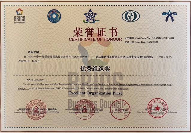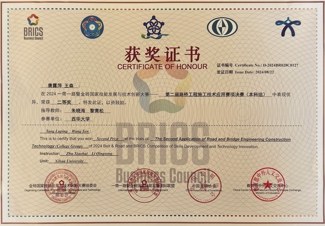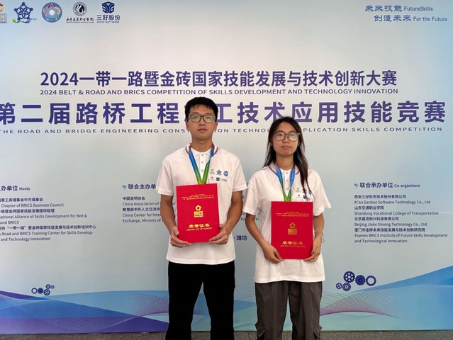 8月20日-22日,2024“一带一路”暨金砖国家技能发展与技术创新大赛——第二届路桥工程施工技术应用赛项决赛(本科组)在山东交通职业学院举行。我校汽车与交通学院交通工程专业学生唐露萍、王森(指导教师:朱晓海、黎青松)荣获全国二等奖,tyc41183太阳成集团荣获“优秀组织奖”。