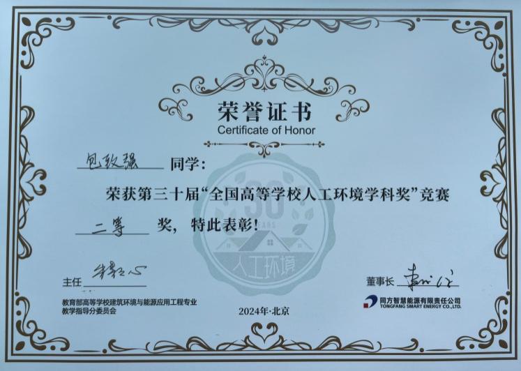8月21日至22日,在教育部高等学校建筑环境与能源应用工程专业教学指导分委员会和同方智慧能源有限责任公司共同主办的第30届全国高等学校人工环境学科奖(简称“人环奖”)竞赛中,我校建筑与土木工程学院建筑环境与能源应用工程专业2021级包致强同学荣获二等奖。本次“人环奖”比赛自2024年5月开始报名,国内133所本科院校2500多名学生报名参加竞赛,经过考试选拔后,有30名学生最终入围决赛。