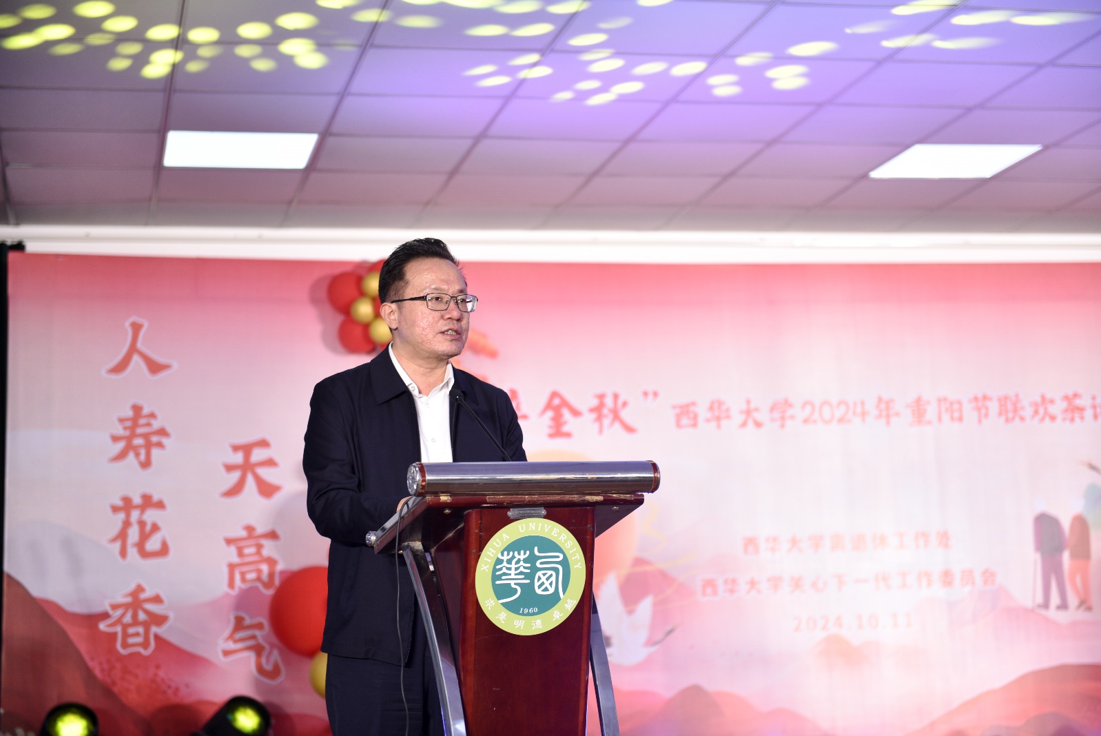 在热烈的掌声中,校党委副书记朱兴华发表了热情洋溢的讲话。他首先代表学校,向离退休老同志致以最诚挚的问候,向为学校发展作出贡献的老领导老同志表达最崇高的敬意。随后,他和大家分享了学校近期在申博、科技创新、招生就业、后勤民生等方面取得的成绩。他表示,这些成绩的取得,离不开各位老同志的辛勤付出,大家是学校事业的建设者、历史的见证者、精神的传播者,正是过去打下的坚实基础,才有今天取得的丰硕成果。在今后的工作中,学校将继续落实好各项福利政策,组织好各类老年活动,努力为大家谋福利、办实事,努力提升老同志的生活质量与幸福感、获得感。