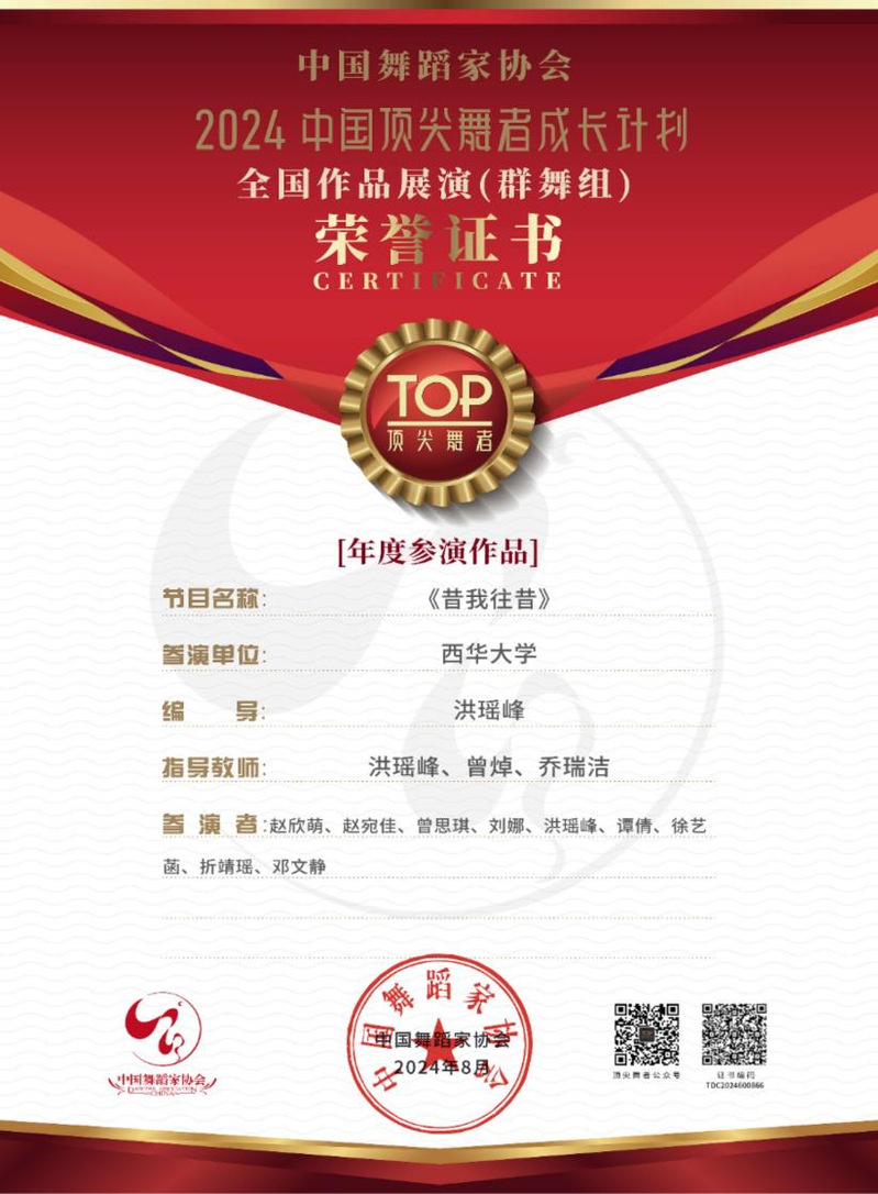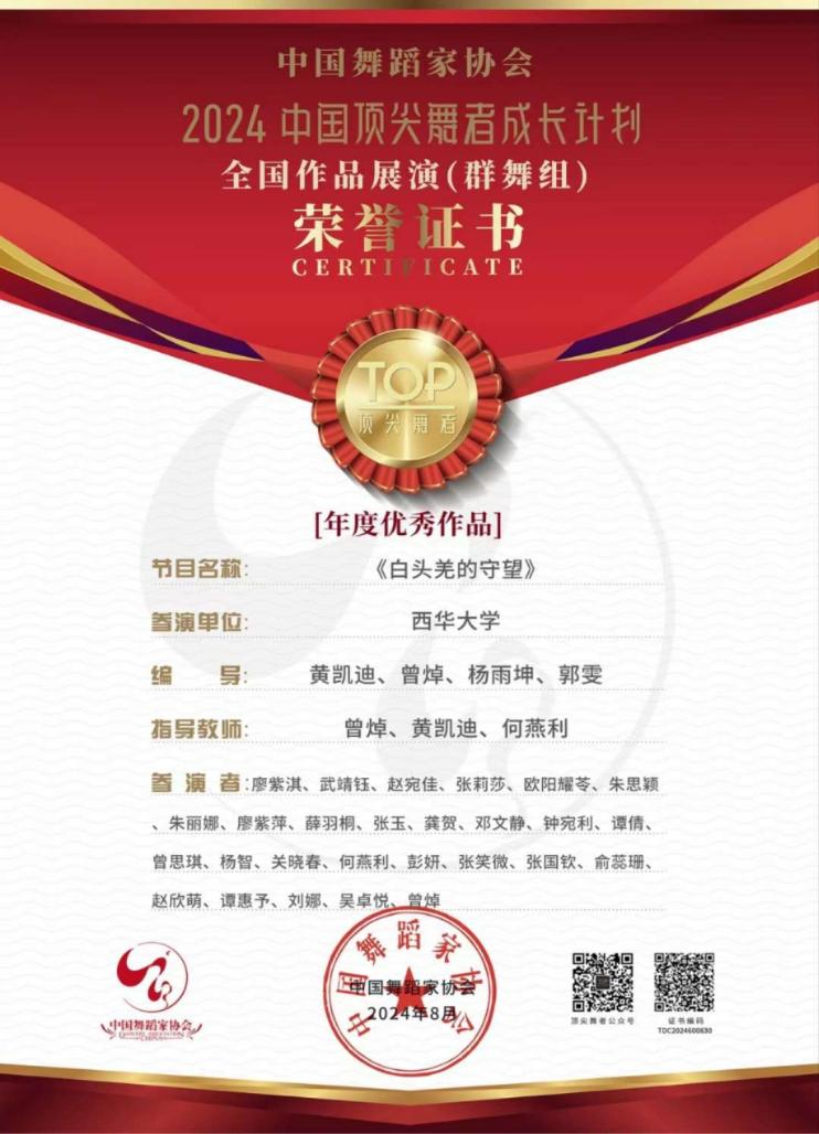 近日,由中国舞蹈家协会主办的“2024 顶尖舞者成长计划全国作品展演”在浙江温州举行。我校音乐与舞蹈学院原创舞蹈作品《白头羌的守望》(群舞组)荣获“年度优秀作品”顶级大奖,《昔我往昔》荣获“年度参演作品”。