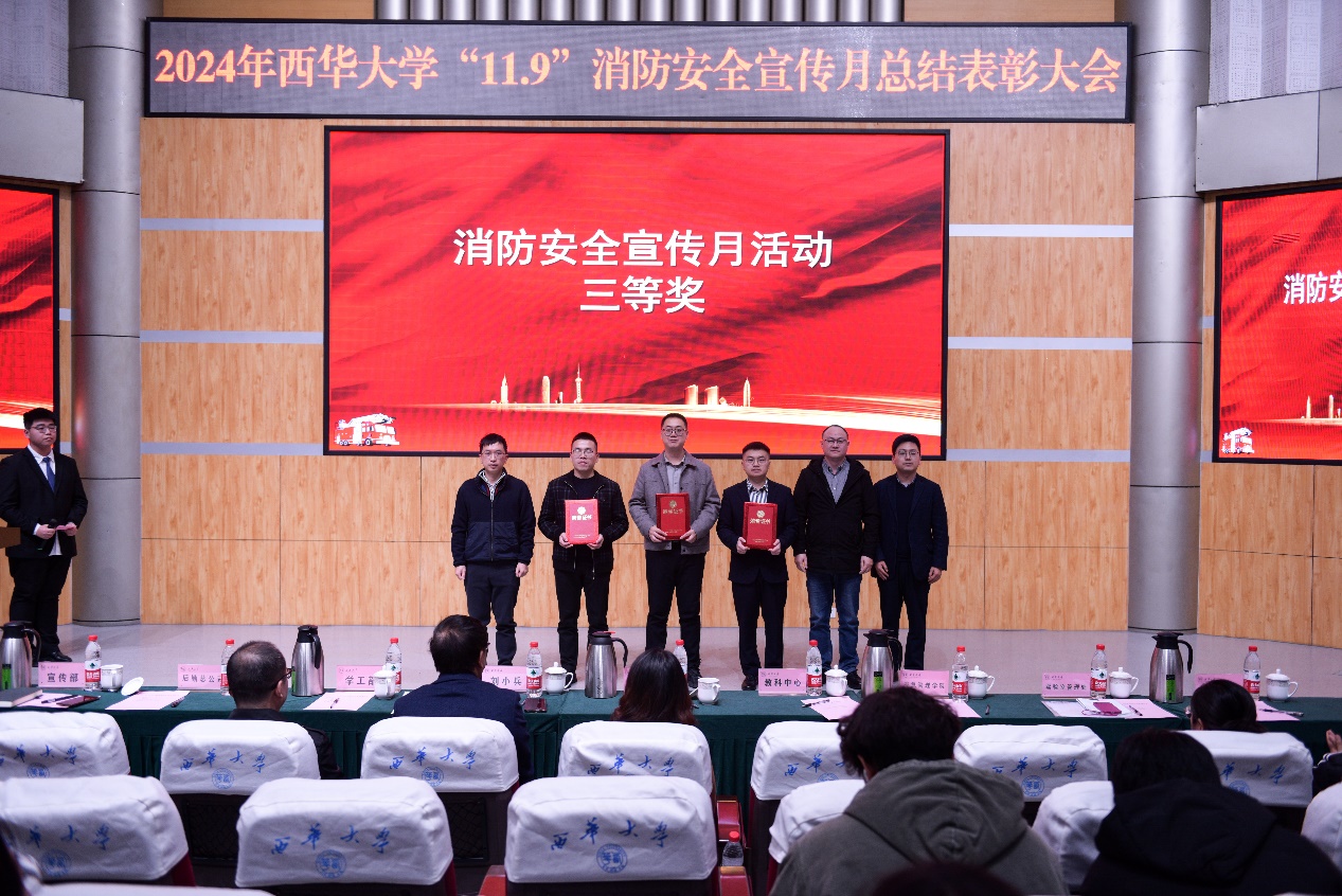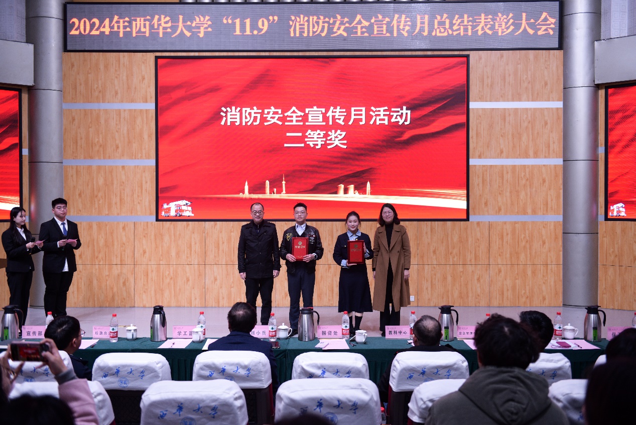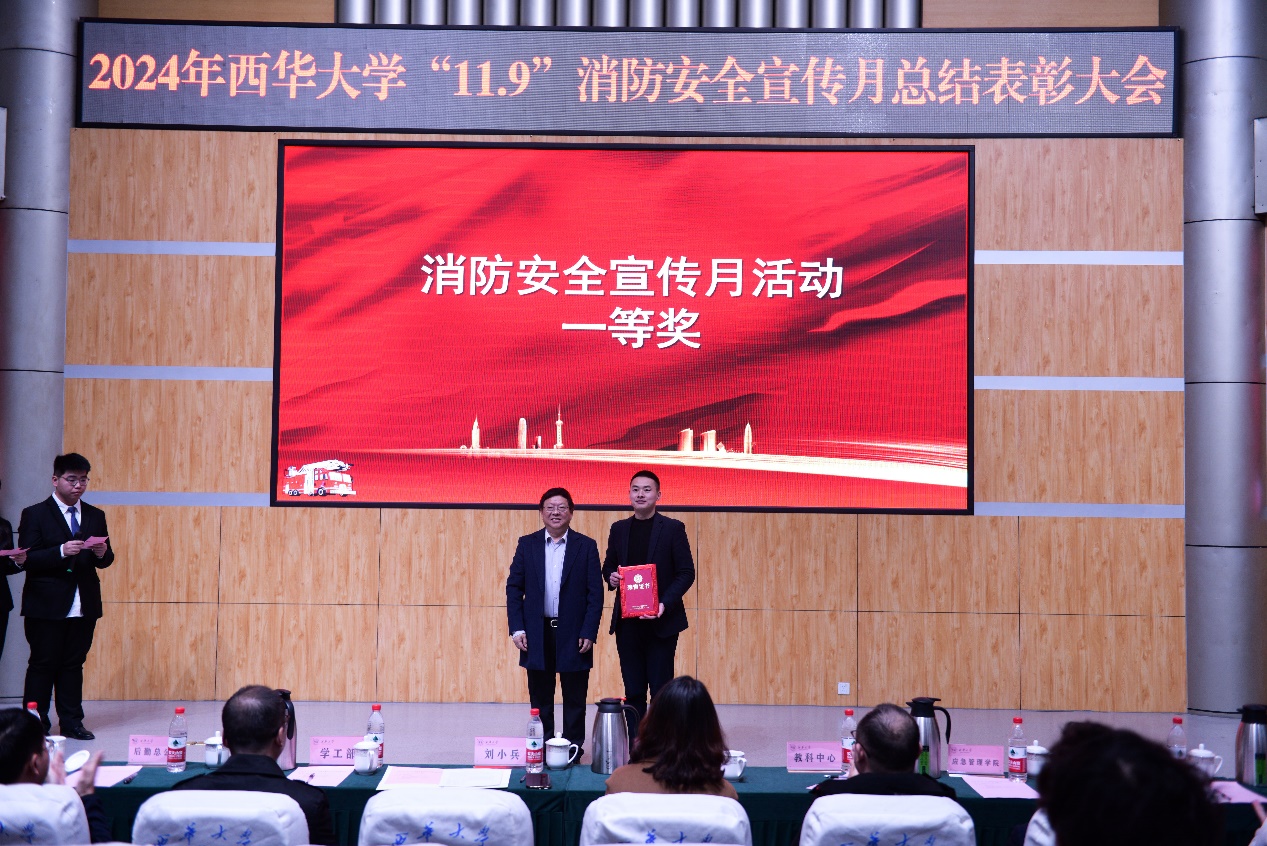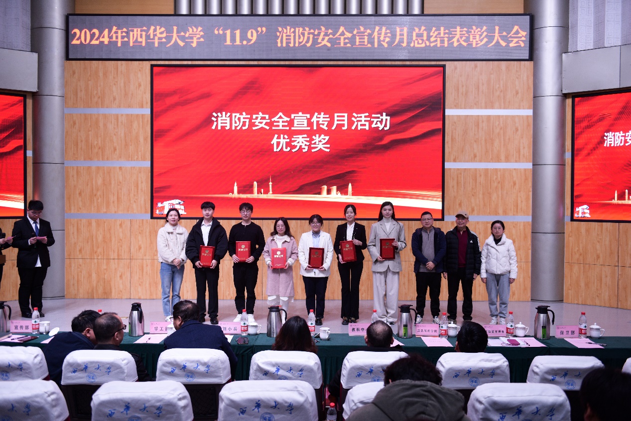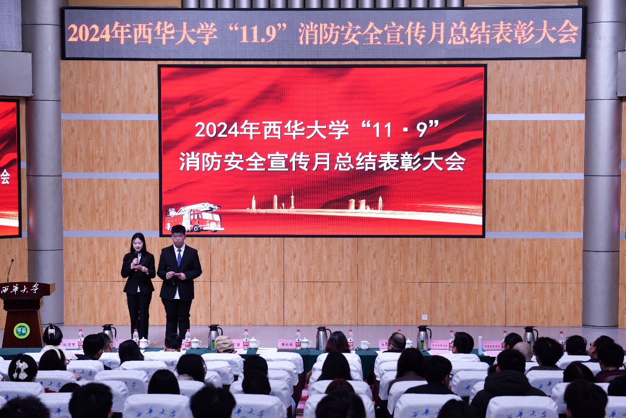 11月29日tyc41183太阳成集团2024年“11•9”消防安全宣传月活动总结暨表彰大会在郫都校区四教报告厅举行。党委常委、副校长刘小兵教授出席会议,党委宣传部、党委学工部、党委保卫部、校团委、国有资产管理处、实验室与设备管理处、后勤服务总公司、教育发展与科创服务中心和应急管理学院等活动主办单位负责人、各学院分管学生工作副书记、各学院师生代表和保卫部全体人员参加了本次会议。