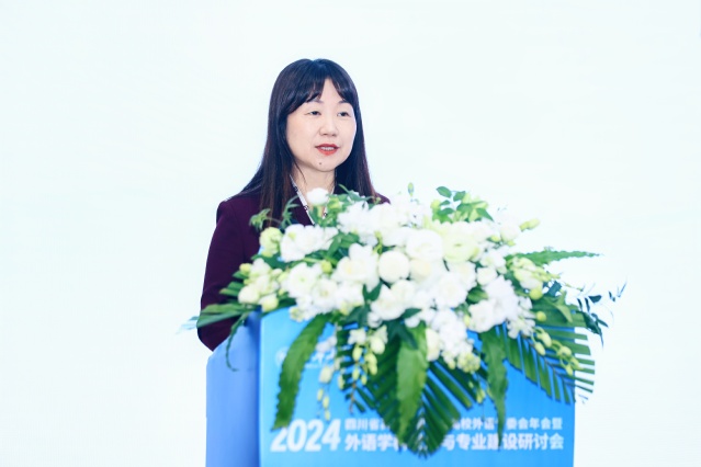 四川省高校外语专委会秘书长、四川大学黄丽君教授以“四川省高等教育学会高校外语专业委员会2024年度工作总结”为题,简要介绍高校外语专委会2024年度在推动四川省高校外语教育教学建设方面的工作成效,以及在外语学科竞赛、外语教学比赛、外语教育教学研讨等方面的平台搭建以及促进外语学科发展所做的工作及成效。