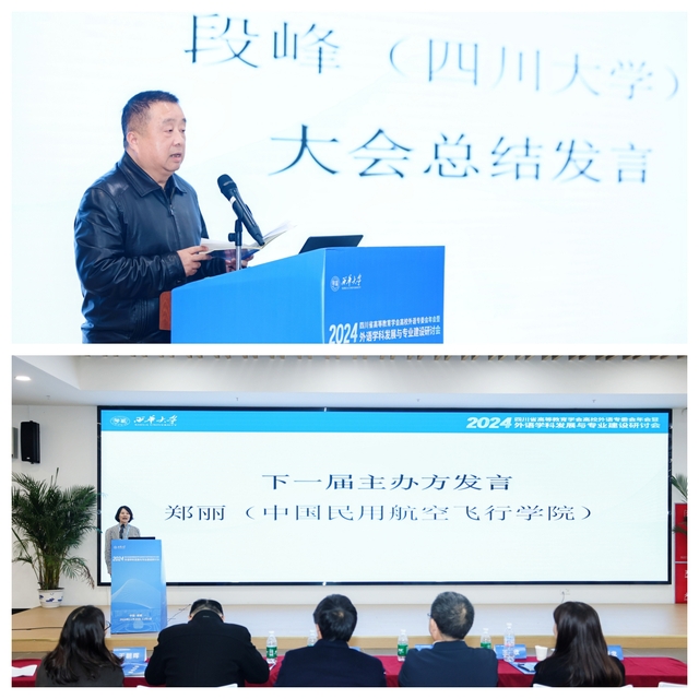 闭幕式上,四川大学段峰教授对本次会议进行了总结。他高度评价了本次年会的各项工作,认为本次年会的圆满召开将进一步推进我省高校外语教育教学的内涵式发展。最后,下一届年会承办方中国民用航空飞行学院外国语学院院长郑丽教授作了承办发言。