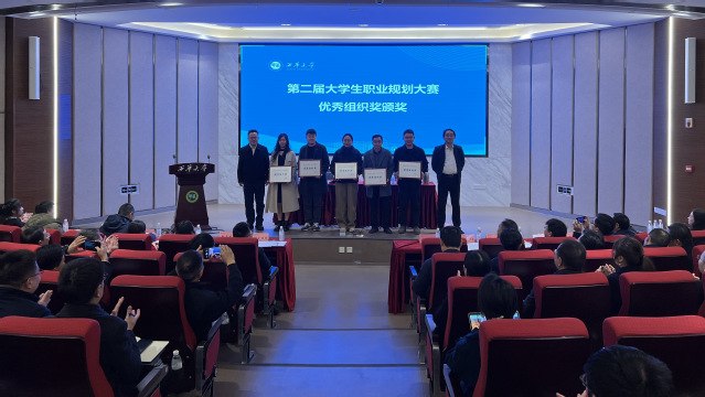 会议现场,文学与新闻传播学院、机械工程学院、建筑与土木工程学院作就业工作交流发言,电气与电子信息学院作职业发展与就业咨询工作室建设交流发言,招生与就业处作2024年度就业工作总结报告。参会校领导为职业发展与就业咨询工作室代表、第二届大学生职业规划大赛优秀组织奖授牌、颁奖。